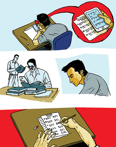 The invigilator is distributing the question paper in a school classroom. Amid stony silence, many aspirants appearing for the selection exam for government jobs are sweating – but not all. One has quietly taken out his smartphone and is taking photographs of the question paper. He then sends it out, and coolly waits for a reply. At another place in town, a man downloads the photos of the question paper, and passes them on to a battery of youngsters who quickly jot down answers, after consulting textbooks and guides. The whole operation runs with an assured smoothness that can come only with long practice. Now the man picks up the phone and starts relaying the answers – just A, B, C or D since this is an objective, multiple choice type question paper – to the right candidates in the exam hall. The select candidates there have come equipped with tiny devises hidden in their ears, and they start ticking off the right answers. Some don’t have Bluetooth, and they get answers through plan SMSs. Many of these ‘fortunate’ candidates in fact complete the test within an hour, instead of the allotted three hours.