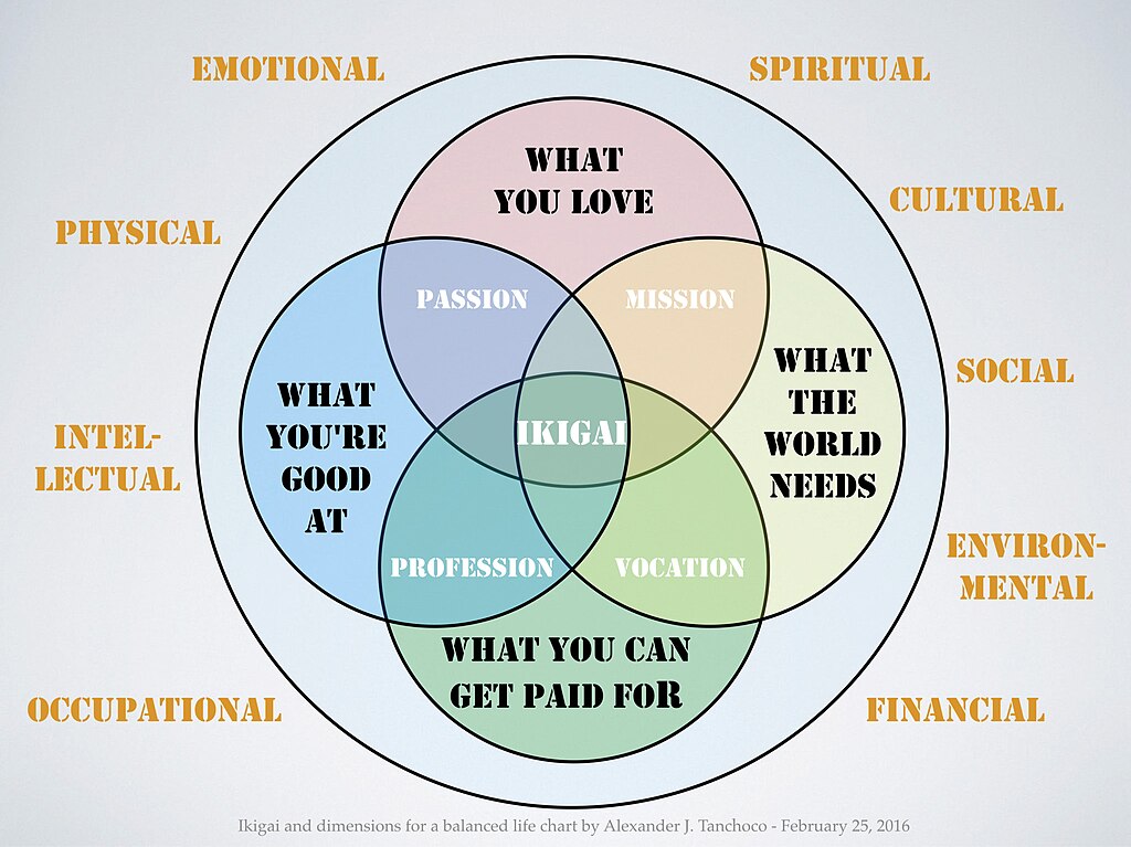 (Image: Courtesy https://commons.wikimedia.org/wiki/File:IkigaiAndDimensionsForABalancedLife.jpg)