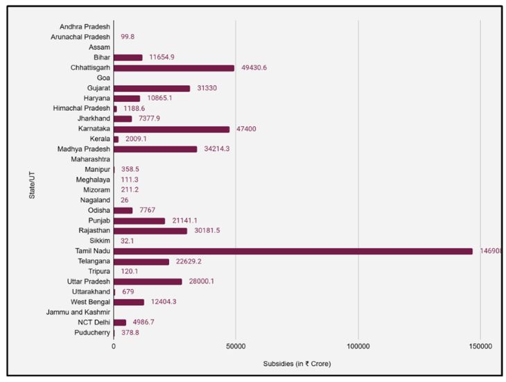 The fiscal consequences are visible in state budgets. According to the RBI, State of State Finance 2024-25, Tamil Nadu recorded the highest subsidy expenditure at ~₹1.47 lakh crore, translating into a per capita subsidy of ~₹19,000. Chhattisgarh followed with subsidy spending of ~₹49,000 crore and a per capita figure exceeding ₹16,000.